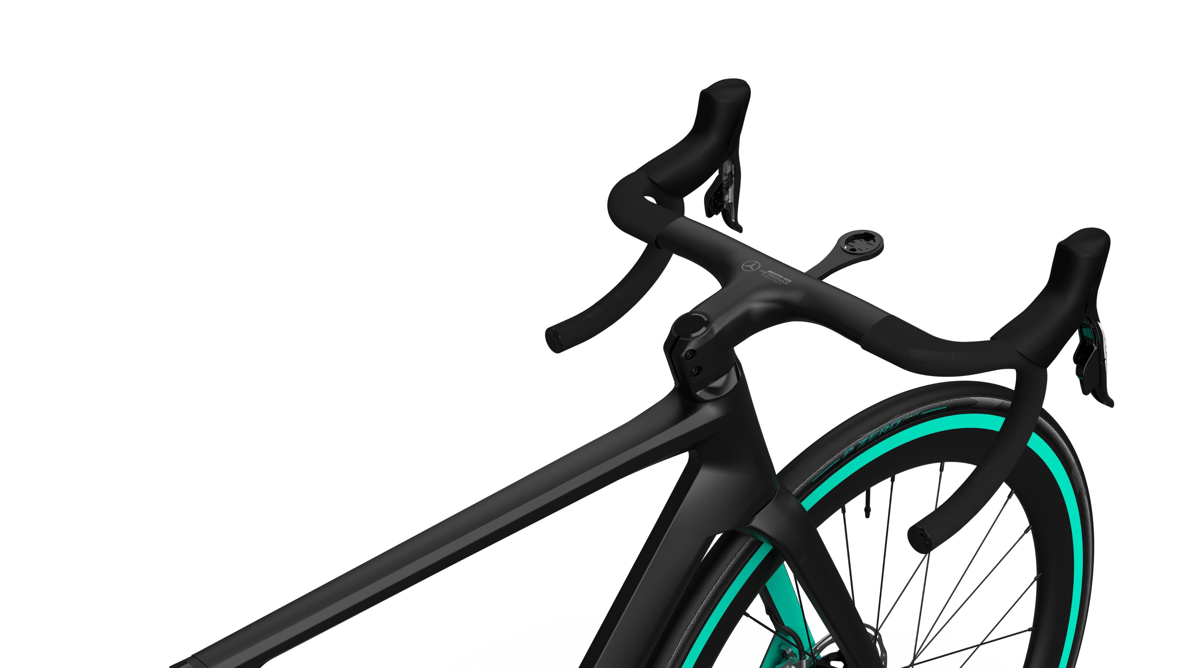 Le cockpit entièrement intégré en fibre de carbone de la Mercedes-AMG F1® intègre le guidon et la potence, dissimule tous les câbles et bénéficie d'une aérodynamique optimisée pour réduire la traînée. L'utilisation du carbone réduit également les vibrations de la route pour un confort accru.